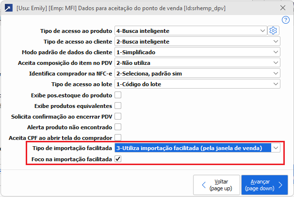 PDV 1.2-A > [Ponto de Venda] > [Dados Aceitação] > “Foco na importação facilitada“