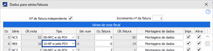 - PDV 1.2-A, botão [Nota Fiscal], botão [Séries/Faturas]: Criar uma série do tipo “10-NF-e pelo PDV”