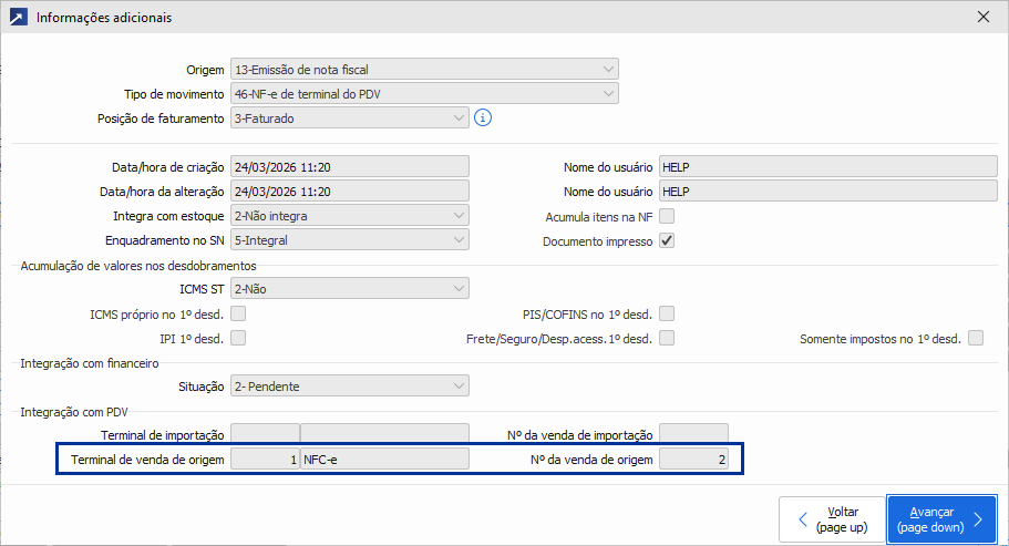 Além disso, o registro de nota emitido também conta com a identificação da venda do PDV que originou a nota. Esses novos campos podem ser visualizados na consulta de nota do menu PDV 2.3-C, botão [Inf.adicionais]: