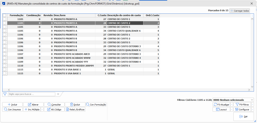 Através das novas opções se torna possível a inclusão, alteração e exclusão de múltiplos registros de centros de custo, operações e insumos na ordenação desejada. Outra funcionalidade interessante é a possibilidade de alteração de código sem a perder a estrutura atual. Ou seja, se torna possível trocar o código do centro de custo, operação ou insumo em lote, sem perder as informações existentes nestes registros ou em sua estrutura. Além disso, devido as rotinas utilizarem como base a manutenção consolidada se torna possível filtrar somente os registros necessários e, com o uso da seleção múltipla, efetuar ajustes de forma intercalada, trazendo maior flexibilidade para as alterações.