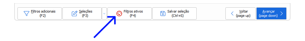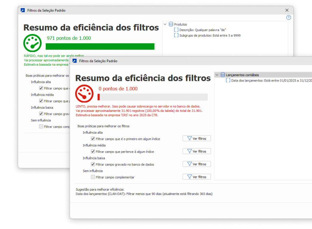 É possível ver sugestões para melhorar esses filtros clicando no botão “Filtros ativos” ou pressionando F4 na janela de Seleção Padrão. A janela contém um resumo da eficiência dos filtros, com uma pontuação inteligente atribuída pelo sistema com base no total de registros que serão exibidos em comparação com o tamanho da tabela na base de dados.
