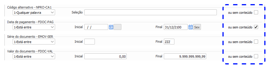 Mais recentemente, essa funcionalidade foi expandida para campos numéricos e alfanuméricos não obrigatórios. Isso permite filtrar por todos os registros que tenham vínculo a um filtro FK avançado ou que não correspondam ao filtro, por exemplo.