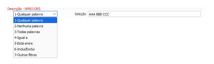O filtro padrão para campos de texto comum (como “Descrição”, “Abreviação” e “Cidade”) passa a ser “qualquer palavra”, em vez de “está entre”. Esse filtro faz com que a busca no banco de dados procure por registros com qualquer uma das palavras digitadas nesse buffer. Os filtros antigos não foram alterados.