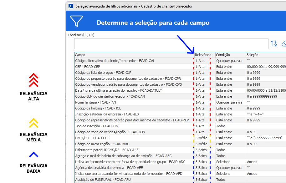Agora ficou mais fácil encontrar campos específicos nos filtros adicionais. Ao clicar no botão ou pressionar F2, a ordenação padrão dos campos é por relevância. Isso significa que os campos mais importantes da tabela aparecem no topo da página, o que deve facilitar a escolha sem a necessidade de busca em grande parte dos casos.