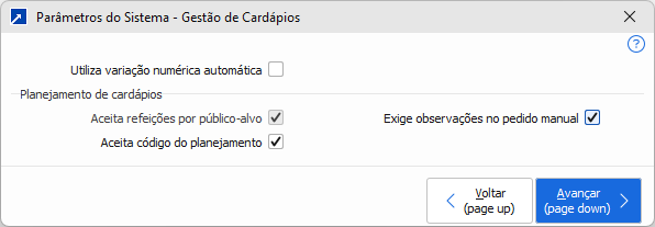 Nos parâmetros dos sistema encontram-se as configurações referentes ao planejamento de cardápios. Acesse através do menu 1.1-P, botão [Gestão de Cardápios].