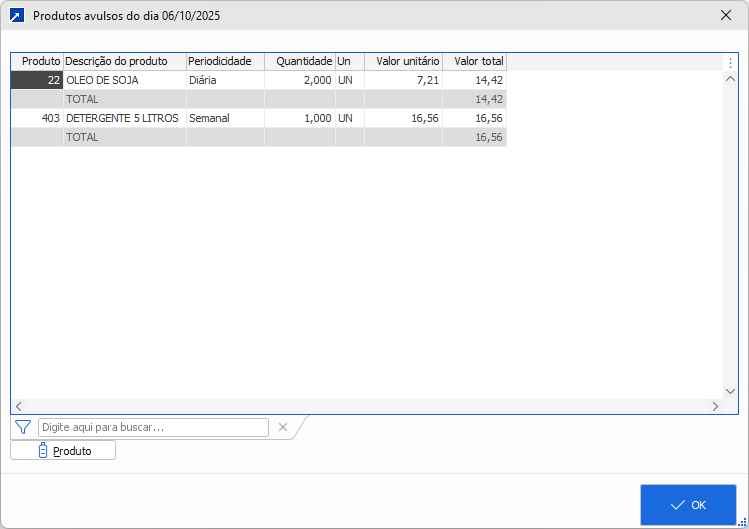 - Os produtos avulsos diários serão incluídos nos pedidos dos dias em que há refeições previstas, conforme o cadastro do centro de custo.