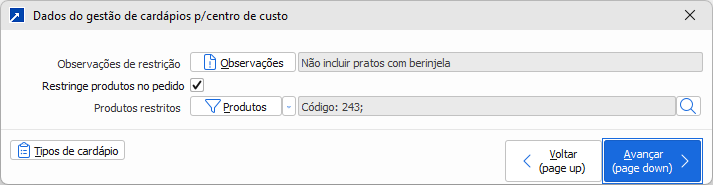 Também podem ser definidas as restrições para o centro de custo, cadastradas através de observações ou por uma seleção de ingredientes não aceitos pelo cliente.
