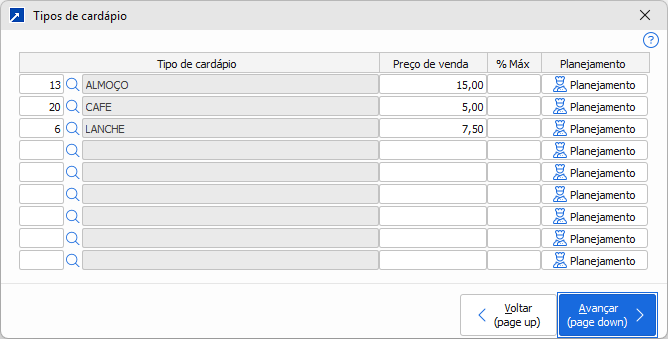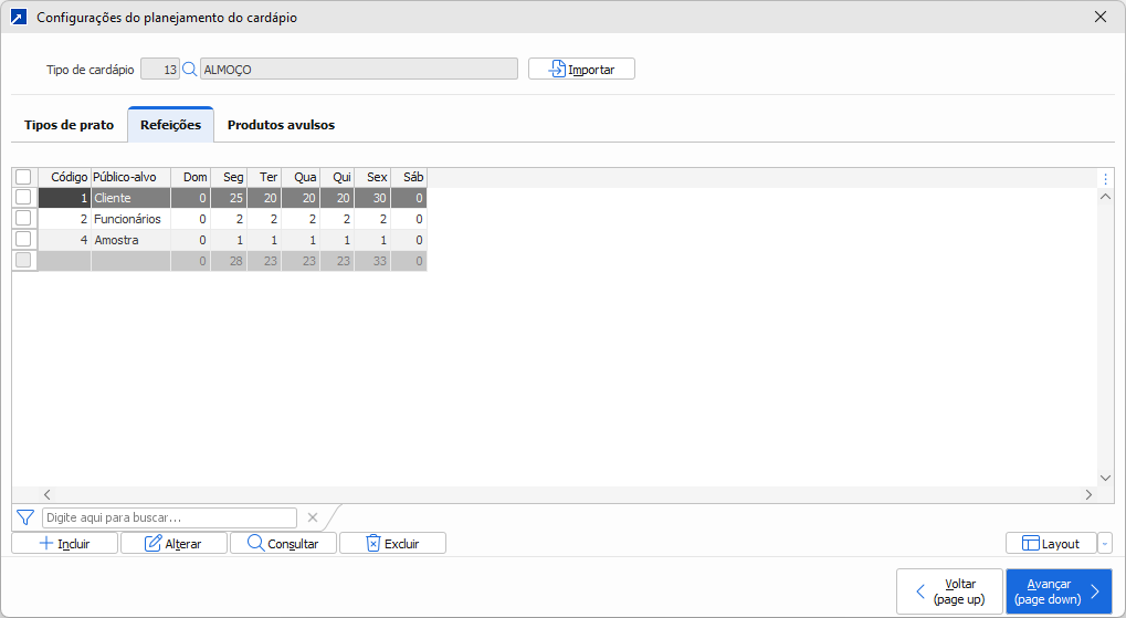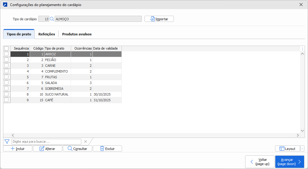 Já no planejamento dos centros de custo a lista de tipos de prato é carregada automaticamente a partir do cadastro. Dessa forma, ao utilizar o recurso de importar os dados do planejamento padrão, o cadastramento dos planejamentos por centro de custo pode ser totalmente automatizado.