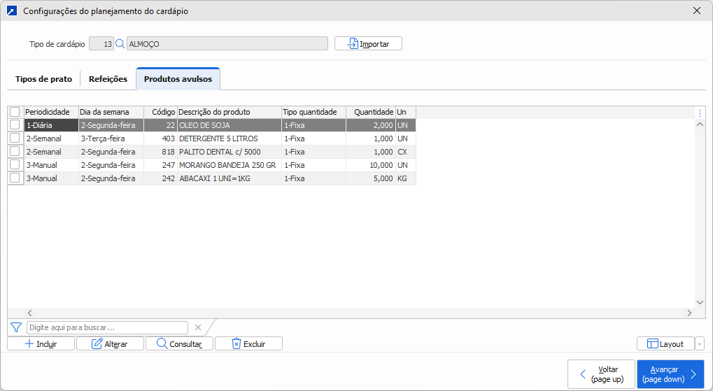 No planejamento padrão os tipos de prato são definidos manualmente, mas há a possibilidade de importar os dados de outro planejamento para agilizar o cadastro, através do botão [Importar].