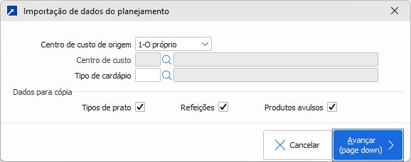 Para facilitar a manutenção dessas configurações no centro de custo, é possível importar os dados do planejamento de outro tipo de cardápio do centro de custo ou a partir de outro centro de custo.