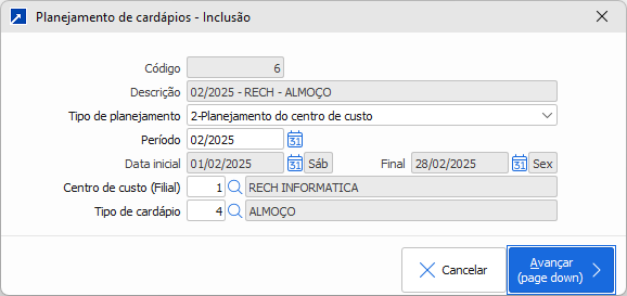 - Na inclusão do planejamento do centro de custo, se existir planejamento padrão para o mesmo período e tipo de cardápio, o sistema questiona se deseja importar.
