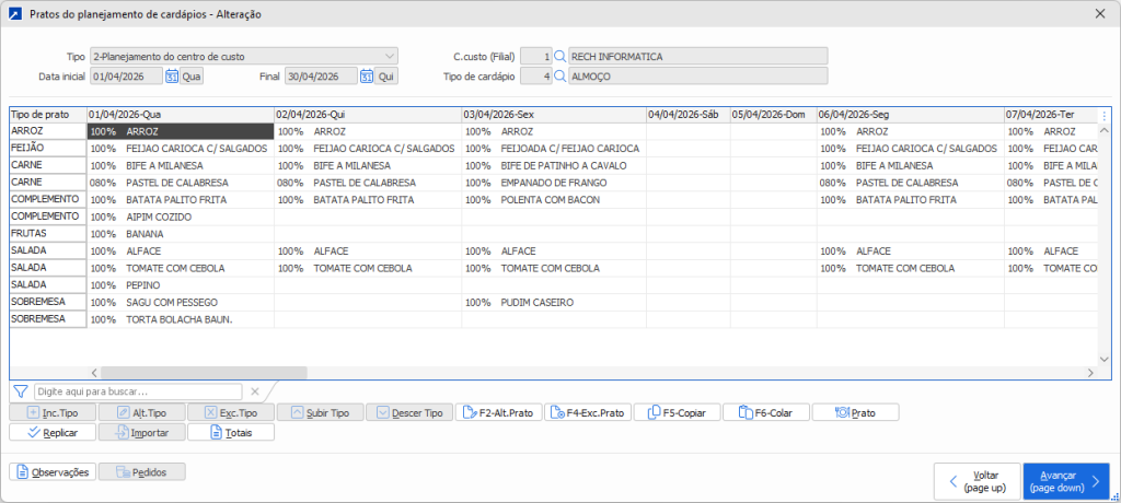 Na janela de manutenção dos pratos do planejamento (janela acima), cada linha do grid corresponde a um tipo de prato, e cada coluna do grid é um dia do período. Portanto, cada célula é o prato referente àquele tipo de prato para o dia.