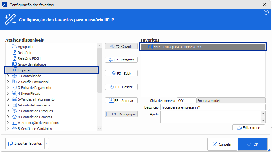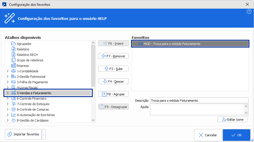 Agora, se o foco estiver em um nodo que representa um módulo na árvore de seleção, também será possível inseri-lo na lista de atalhos do usuário. Ao ser acionada, essa opção fará com que o sistema alterne para o módulo correspondente.