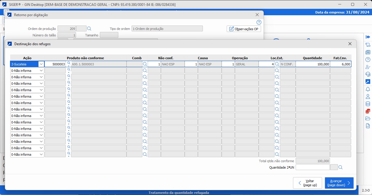 Configure destinos como sucateamento, reclassificação ou retrabalho para cada tipo de refugo gerado.