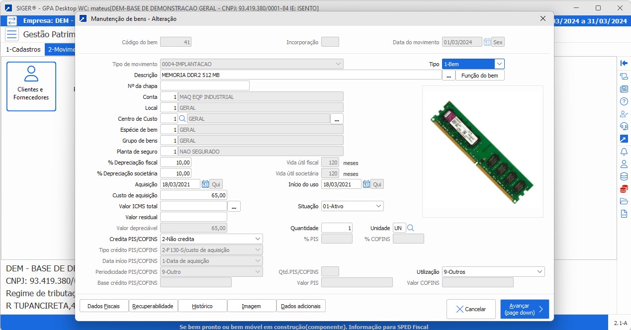 • Cadastramento de bens por centros de custo, grupos de bens, contas patrimoniais, locais patrimoniais e plantas de seguros, que definem o tipo de bem e o regime de depreciação, amortização e exaustão