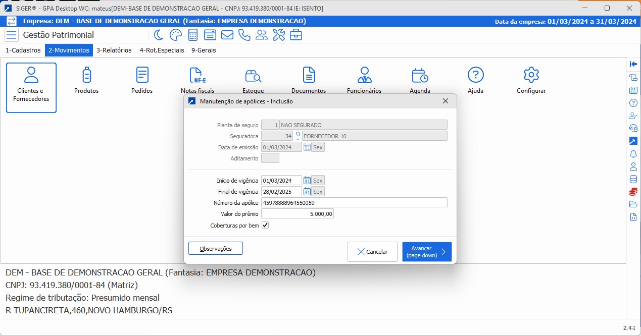 • Controle as apólices de seguros dos bens patrimoniais, com opção de emitir relatórios para monitoramento