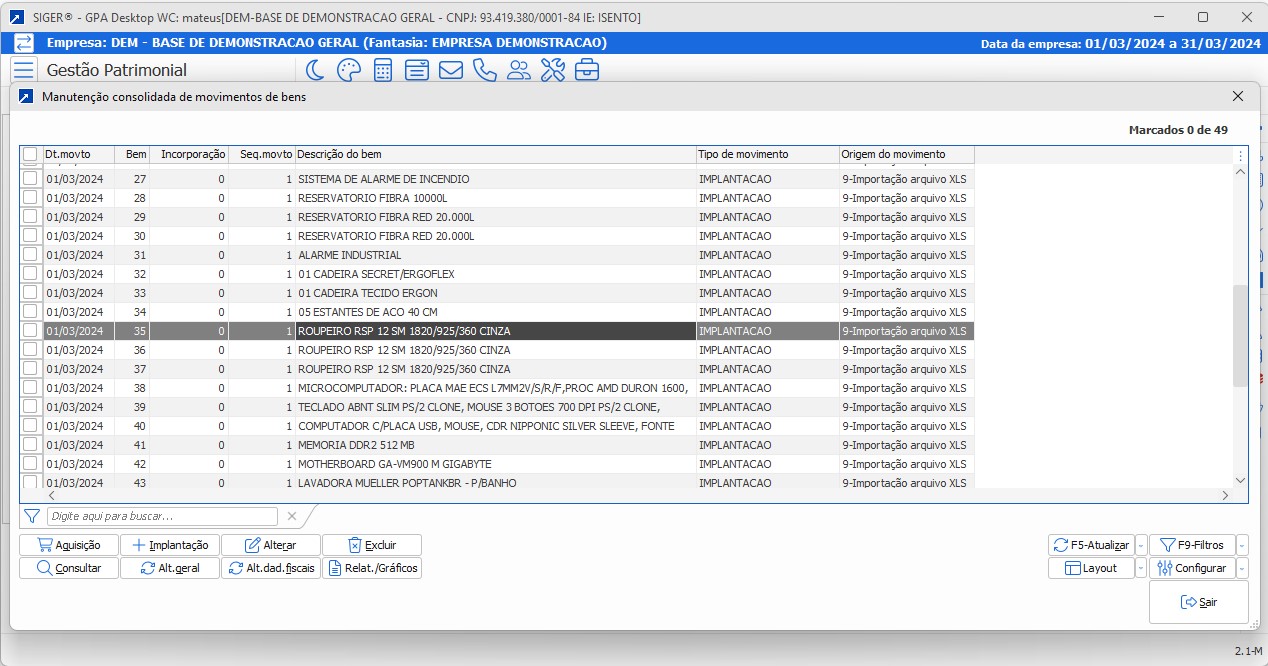 • Permite a inclusão múltipla de bens, lançamento de aquisição e implantação de bens
