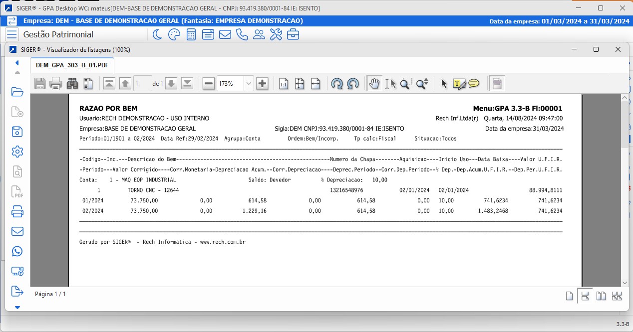 • Relatório de aquisições, baixas, transferências, desmembramentos e uniões no período com valor atualizado, depreciação acumulada e valor residual