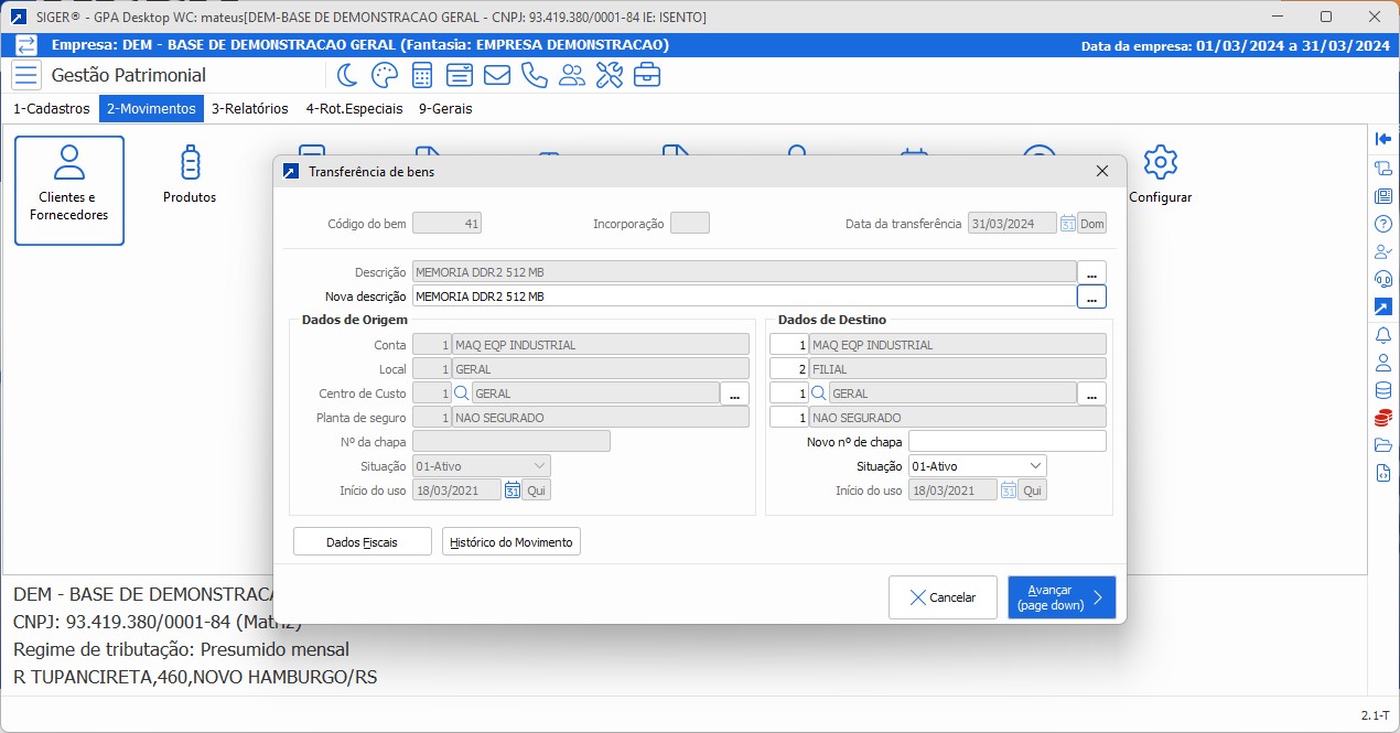 • Possibilidade de efetuar a transferência de conta patrimonial e de código do bem