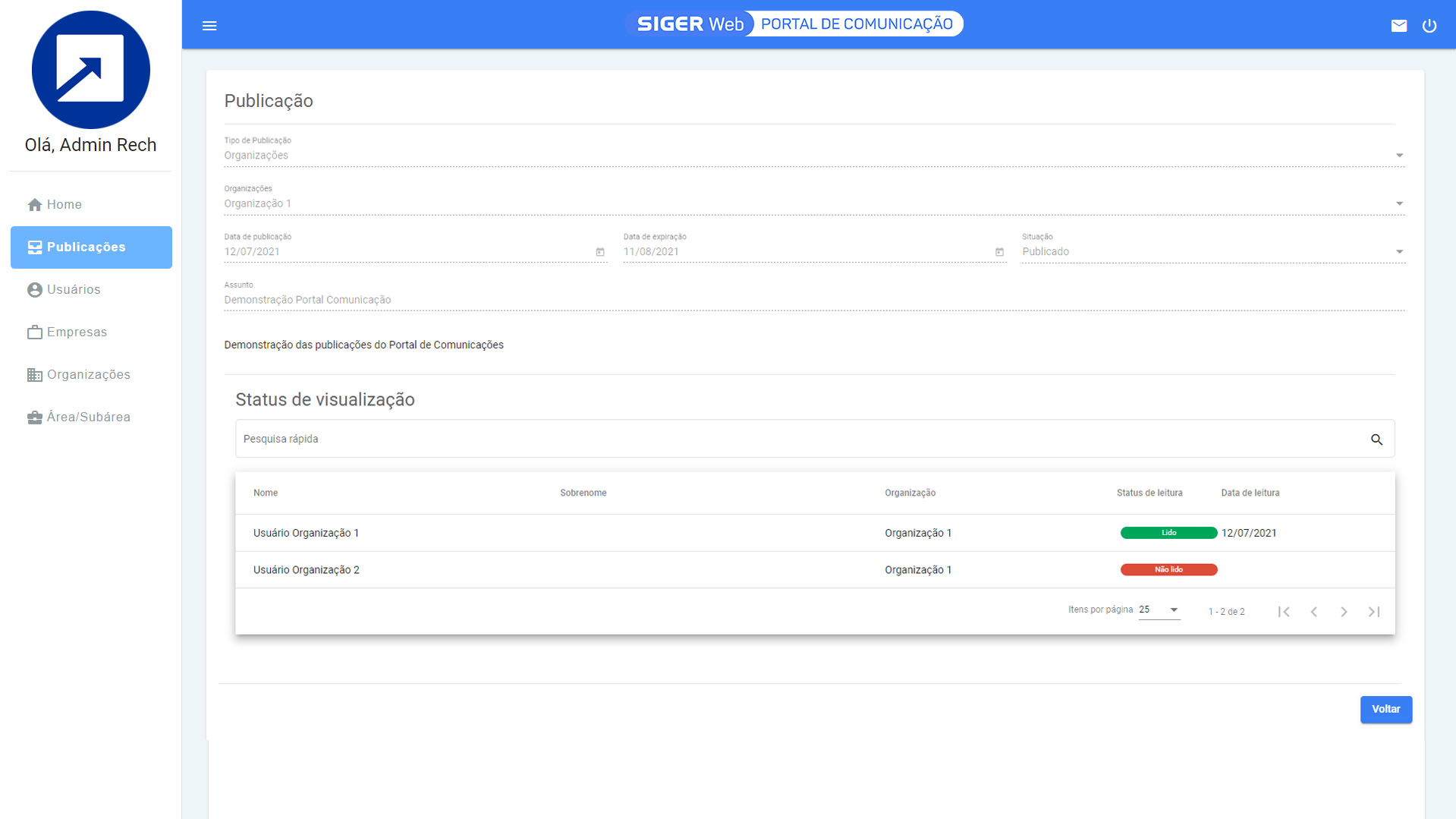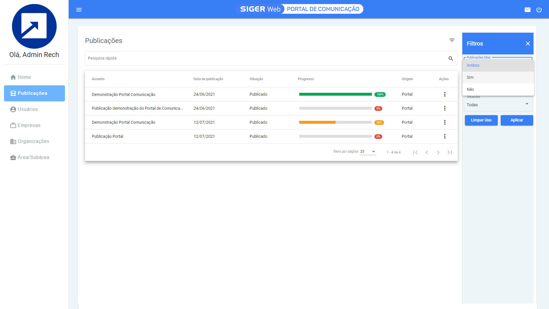 Gere relatórios de publicações para auditoria e acompanhamento das comunicações.
