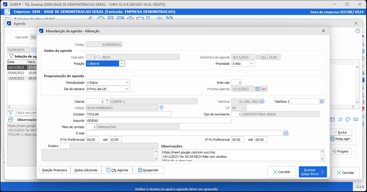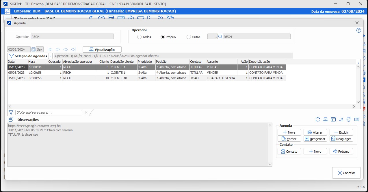 Evite esquecimentos e garanta cumprimento de rotinas com alertas programáveis diretamente na agenda do operador.