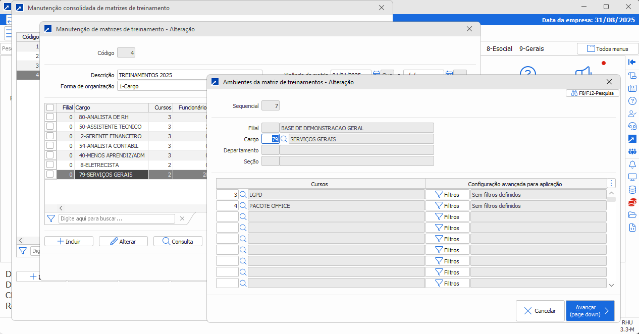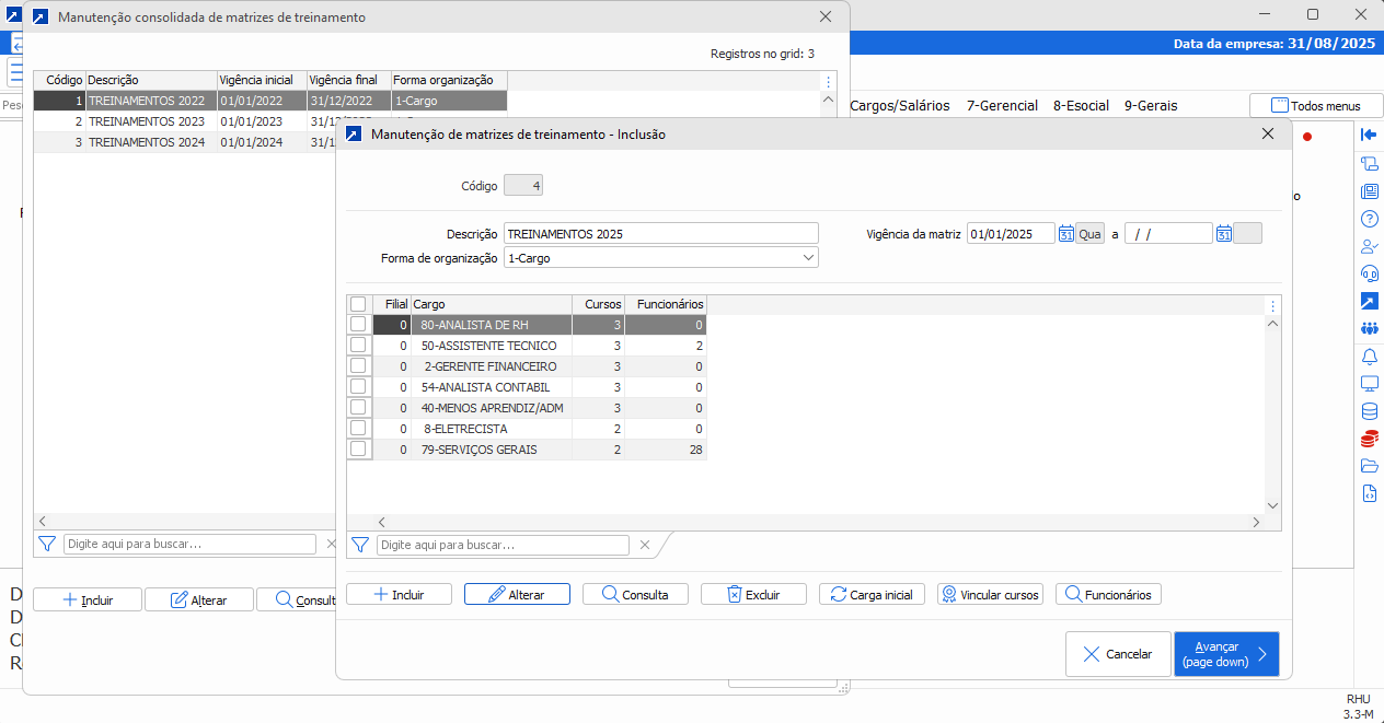 Inclua informações como duração, tipo e modalidade para cada treinamento promovido pela empresa.