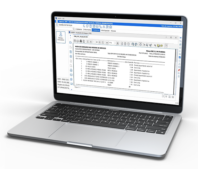 Controle da prestação de serviços industriais, materiais aplicados, rastreabilidade por número de série e custos operacionais.