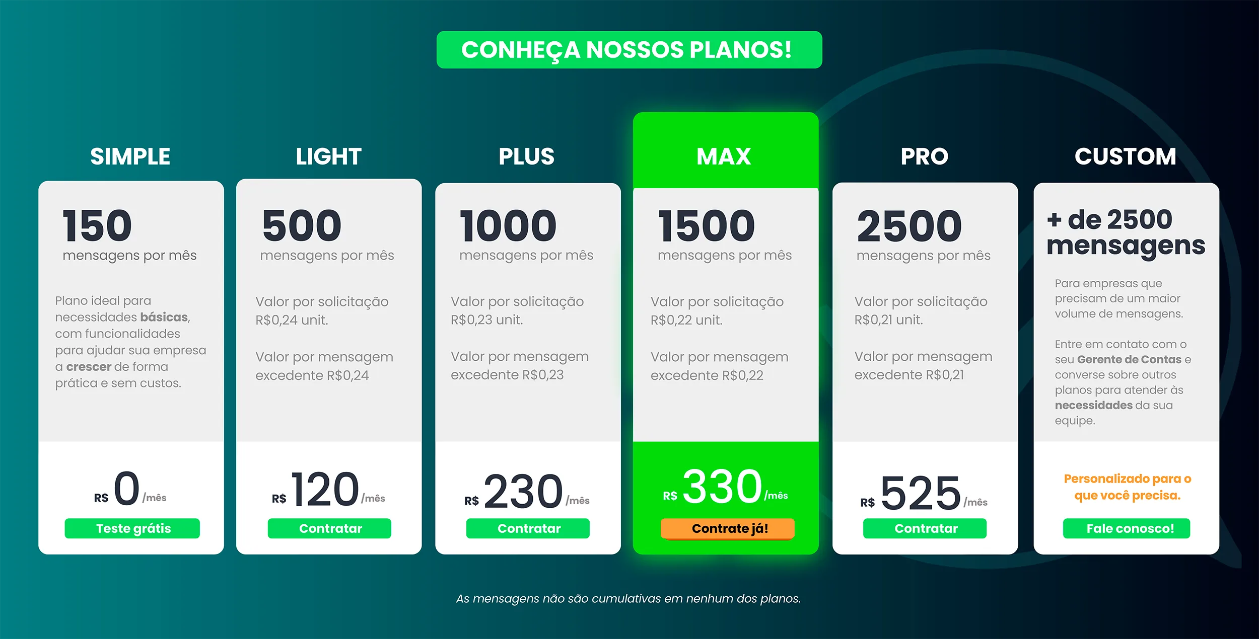 Nossos planos foram criados para atender desde pequenas necessidades até grandes demandas de comunicação. Você pode começar com o plano gratuito SIMPLE de 150 mensagens/mês e evoluir para opções como LIGHT, PLUS, MAX ou PRO, que oferecem volumes maiores e valores por mensagem mais competitivos. E se precisar de algo totalmente sob medida, o CUSTOM garante flexibilidade para atender ao seu negócio. Escolha o plano certo e mantenha sua comunicação sempre ativa e eficiente.