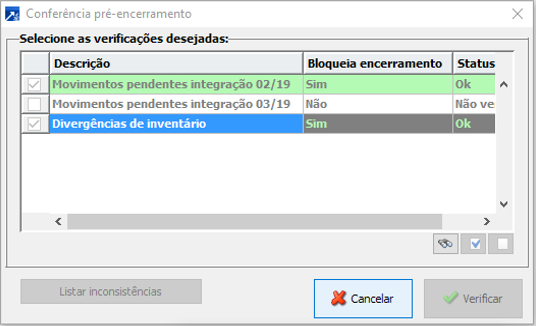 Ao acessar o menu, o SIGER® já vai trazer selecionadas as verificações desejadas considerando analisar todos os movimentos que eventualmente possam barrar o encerramento mensal.