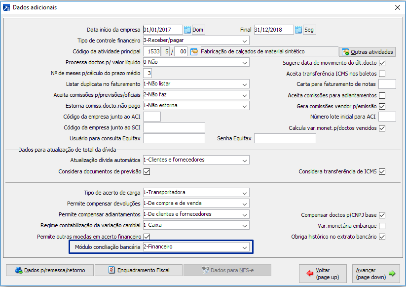 Na empresa do Financeiro ou da Contabilidade, botão <Dados Adicionais>, indicar no campo "Módulo conciliação bancária" se irá a utilizar a rotina de importação e conciliação bancária pelo Financeiro ou pela Contabilidade.