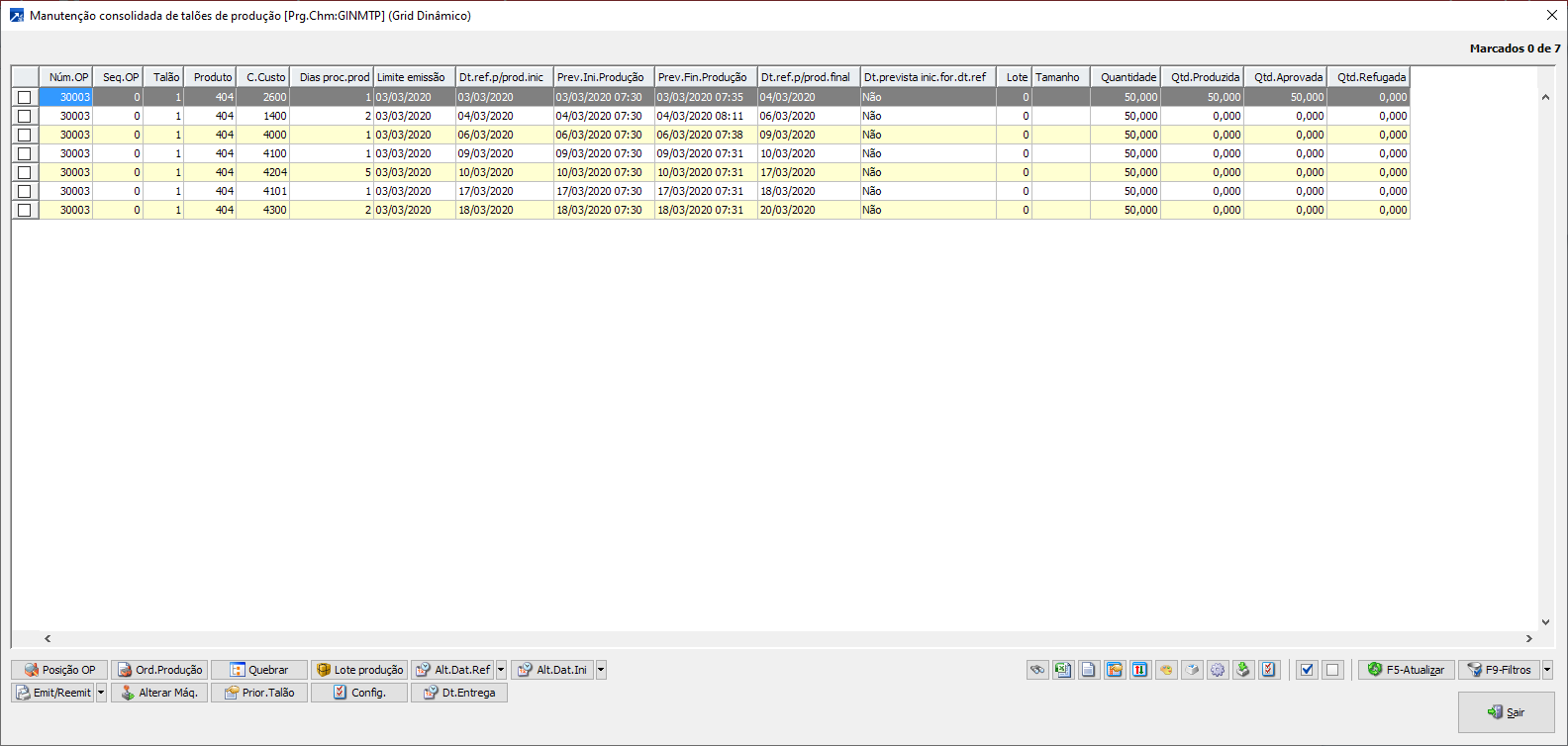 Abaixo é exibida a Janela de Manutenção Consolidada de talões filtrando uma ordem de produção programada para 20/03/2020, exibindo os talões juntamente com os centros de custo, os dias de processo, e as datas de referência definidas automaticamente na emissão dos talões: