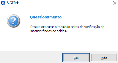 SIGER® vai solicitar se deseja executar o recálculo antes da verificação de inconsistência de saldos. Na rotina de encerramento mensal será questionada a execução de recálculo em dois pontos - antes da verificação de inconsistência de saldos e ao final do processo de encerramento mensal. Indicamos que ambos sejam feitos.