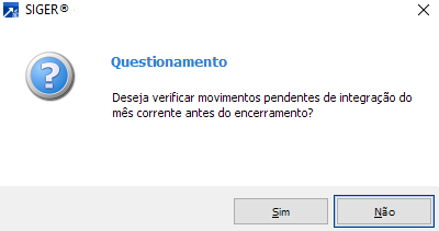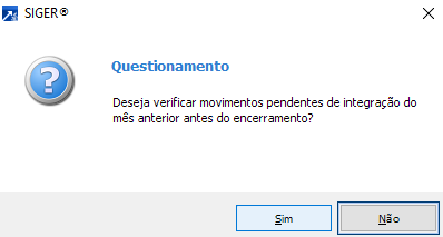Também será questionado se deseja verificar movimentos pendentes de integração no mês anterior antes do encerramento.