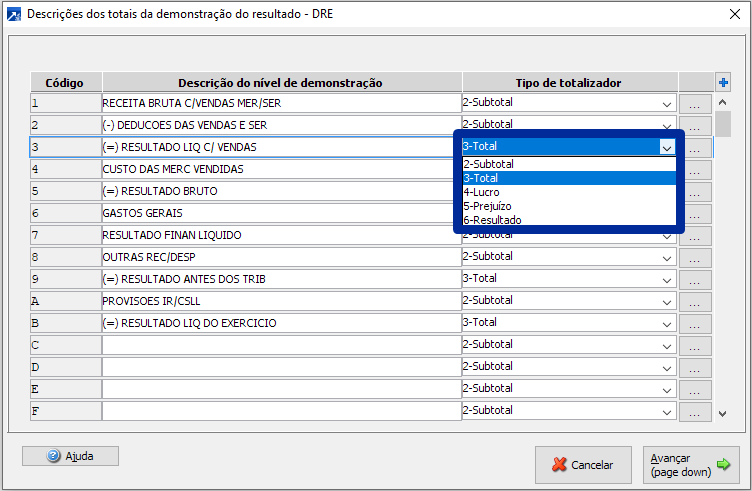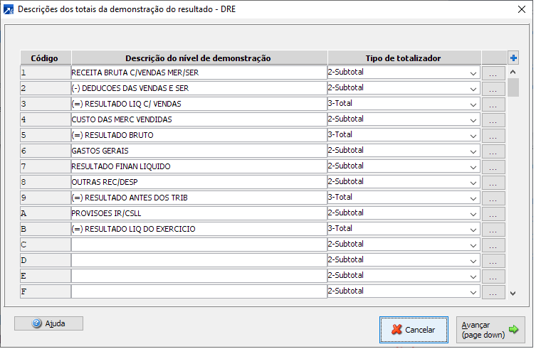 No módulo de contabilidade é possível fazer a definição dos níveis da DRE em qualquer grau no plano de contas, a partir do 3º grau (contas sintéticas), e utilizar sub-totalizadores na demonstração, acumulando os saldos por níveis, contas ou grupos.