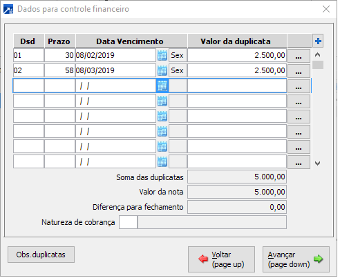 Ao avançar, serão mostrados os dados para desdobramento, para novos vencimentos e valores. Utilize as funções F4 e F6 para criação dos desdobramentos automaticamente.