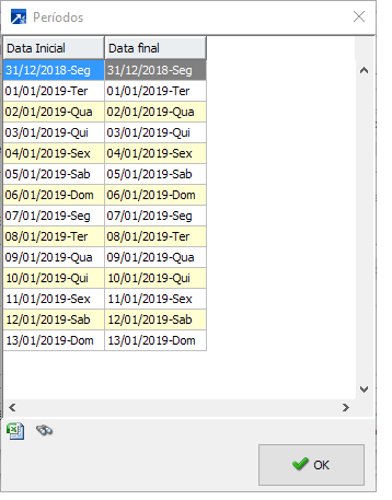 Ao clicar nesse botão, é possível visualizar em um grid os períodos que serão criados utilizando a seleção definida pelo usuário. Assim o usuário poderá saber quais períodos serão criados e ajustar a seleção com mais precisão.