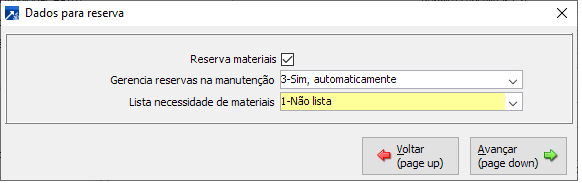 1-Não: Não gerencia a reserva dos materiais na manutenção da OS. Não irá abrir a janela para o gerenciamento dos materiais e não irá reservar os materiais após a inclusão/alteração da OS.