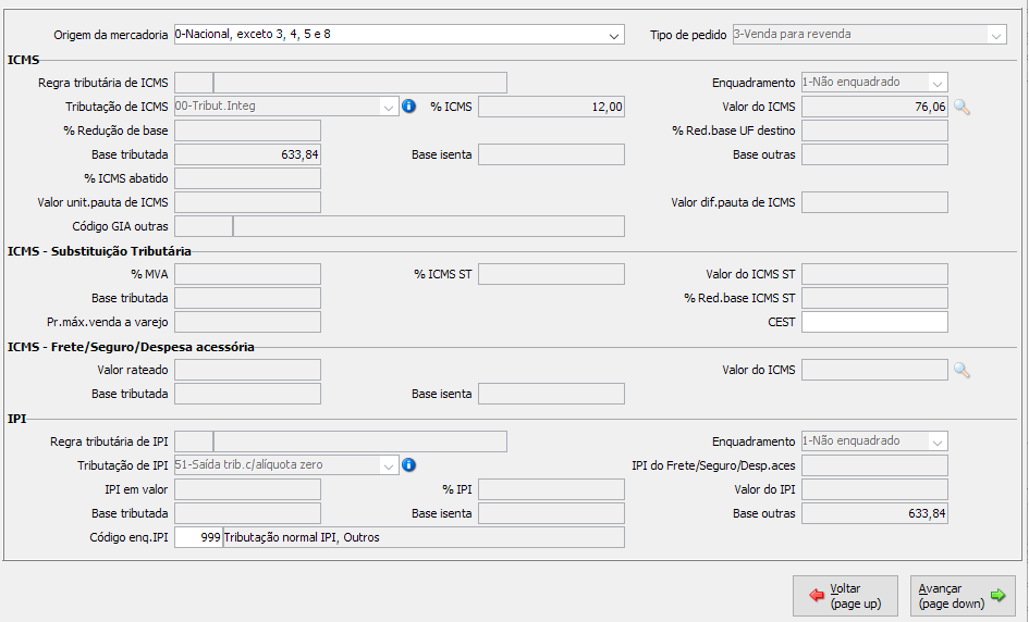 Regras tributárias de IPI e de ICMS, conforme configurações.