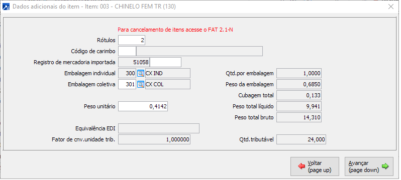 Para que a aceitação dos itens do pedido seja detalhada (um item por janela), deve ser feita uma configuração no menu FAT 1.1-P, botão <Vendas e Faturamento 2>, botão <Pedidos/Notas Fiscais>, campo "Tipo de digitação de itens do pedido", opção 1-Uma janela por item.