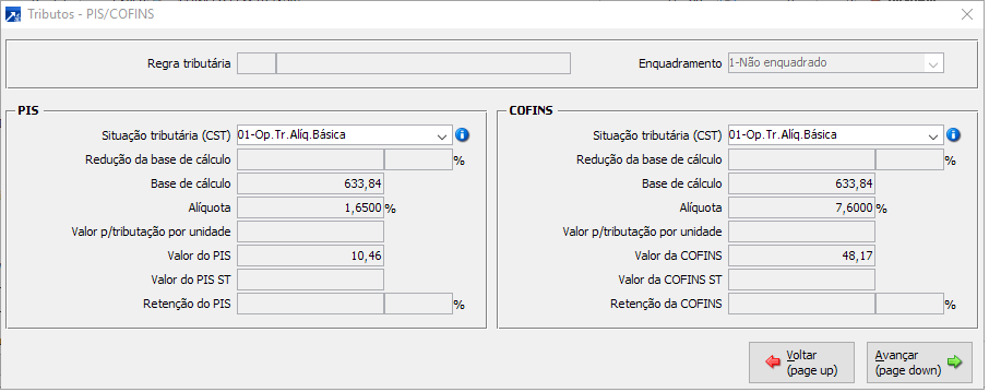 Regras tributárias de PIS/COFINS, conforme configurações.