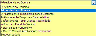 Selecionar o tipo de afastamento para o eSocial. Usar o Botão F8 para selecionar o motivo.