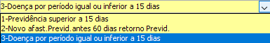 Selecionar o tipo de complemento. Neste exemplo o afastamento de prvidência, o atestado é superior a 15 dias, inferior ou igual a 15 dias ou e o mesmo afastamento que o funcionário retorno dentro do prazo de 60 dias.
