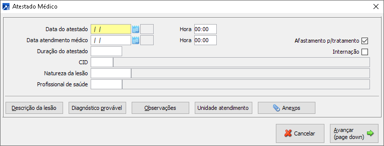 Quando o fastamento for Previdência ou Acidente de trabalho, informar neste botão os dados do atestado.
