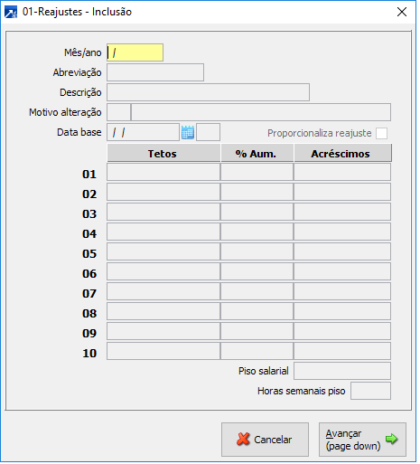 - Cadastrar a tabela de reajuste por empresa no MENU 1.4-Incluir tabala 01-Tabela de Reajustes. Esta opção permite você incluir os valões de salário quando usado faixas, ou seja, até um determinado teto salarial um percentual e até outro teto outro percentual, ou ainda, poderá fazer um reajuste de um valor X por faixa de salário.