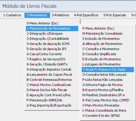 Acessando o módulo LFI - LIVROS FISCAIS menu 2.1-T