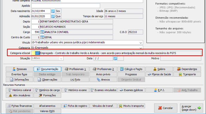 Na contratação do funcionário na modalidade de contrato verde e amarelo, foram criadas duas novas categorias para o eSocial, código 107 e 108 menu 1.8-I campo “CATEGORIA ESOCIAL”.