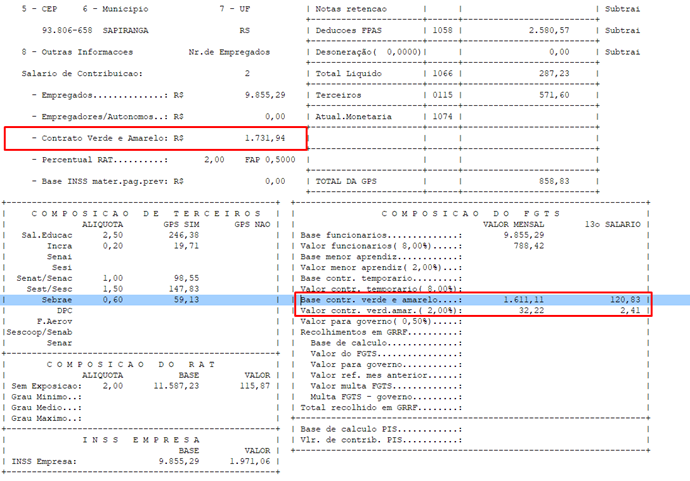 Na listagem da folha mensal menu 4.1-L ou na listagem dos totais menu 4.1-T, foi criado campo para demonstrar a base de cálculo do INSS sobre o Contrato verde e amarelo e na composição do FGTS novos campos que demonstram BASE e valor do FGTS MENSAL e do 13º SALÁRIO.