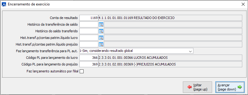 Permite configurar no cadastro de cada empresa as contas contábeis para os lançamentos de transferências dos saldos das contas de resultado e do resultado apurado para o patrimônio líquido, menu 1.2-A, botão <Encerramento Exercício>