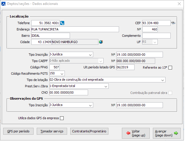 Na tela de dados adicionais abaixo, deves preencher cada item de acordo com o tipo de obra, na dúvida chame o seu contador e leia sempre o que diz na linha amarela do SIGER®. Pontos a observar: local da obra ou prestação do serviço, Tipo de inscrição do tomador ou obra, se pessoa física deves informar o CAEPF, ver o código correto do recolhimento do fgts da obra ou do tomador, tipo de lotação, indicar se obra é total ou parcial, se for de construção civil informar o CNO, informar o tipo de inscrição e o CNPJ que irá listar nas observações da GPS. Se o departamento vai utilizar a mesma configuração da GPS da Empresa/sigla, ou seja, se o tomador é a própria Empresa/sigla, basta marcar a flag "utiliza dados GPS da Empresa" aí não precisa informar nada na aba "GPS por periodo".