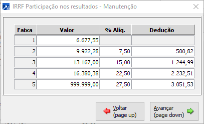 Clicar neste botão, vai abrir uma tela, para informar os valores da tabela de IRRF especifica para calculo de folha de Participações de Lucros e Resultados, conforme dados da Receita Federal.